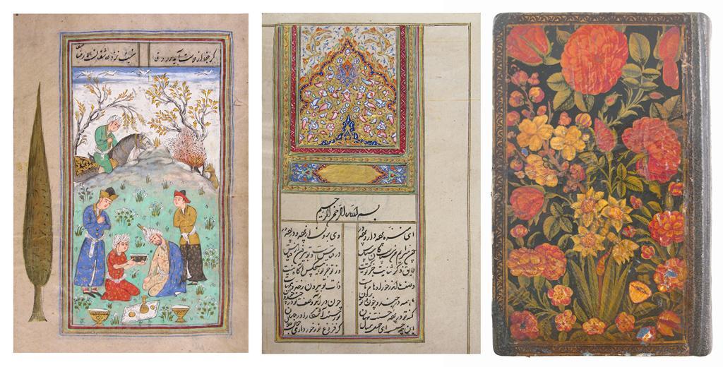 A Persian book of poetry, written in two columns, the illuminated headpiece with gold and red rules throughout, the miniatures in typical Isfahan style, set in gardens with elaborate decoration in gold and polychrome, an original floral lacquer binding, dated 1282 AH corresponding to 1869 AD, one owner's stamp.