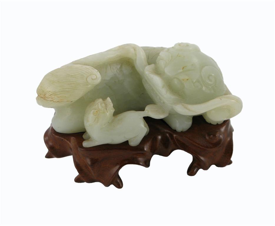 A Chinese jade carving of a recumbent Buddhist lion, holding a ribbon in her mouth and watching over her cub, the stone of a pale celadon tone, 17th / 18th century, 12.2cm. Together with a wood stand. (2)