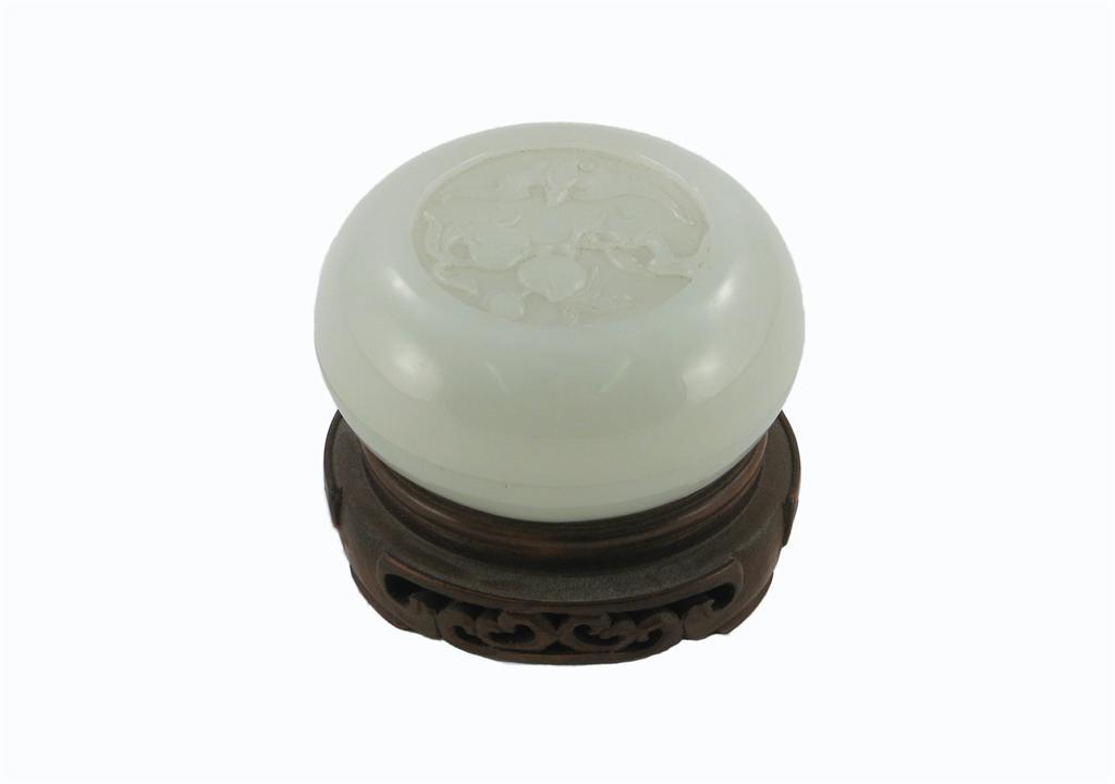 A Chinese pale celadon jade circular box and cover, carved with a roundel containing peaches and a bat, probably 18th century, 7cm. Together with a wood stand. (3)