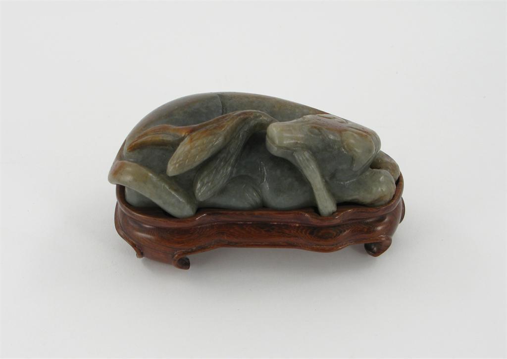 A Chinese jade carving of a recumbent dog, his head turned back over his shoulder and holding a millet branch in his mouth, 18th century, 9.5cm. Together with a wood stand. (2)
