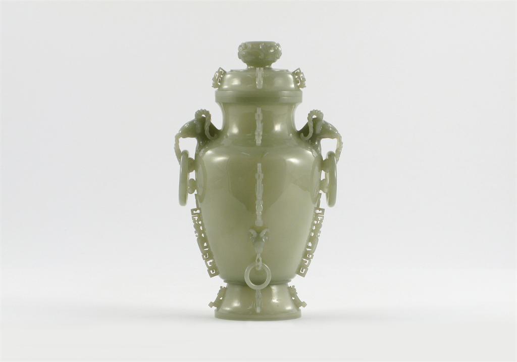 A fine Chinese pale celadon jade vase and cover, with three loose ring handles, the ovoid body carved with vertical hydra scroll flanges and three projecting ram head supports, the cover with a hollow knop carved with confronting dragons, all raised on a flared foot, 25cm. (2)