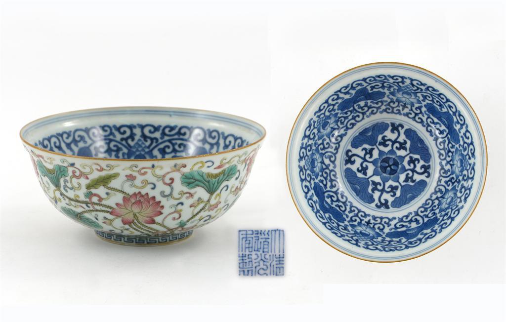 A good Chinese famille rose bowl, the interior painted in underglaze blue with lotus flowers and leaves amidst a wide band of tendrils, the exterior delicately enamelled with lotus above a short foot decorated in blue key fret, the base with a six character Daoguang seal mark and of the period 1821-50, 14.8cm. Together with a hardwood stand. (2)