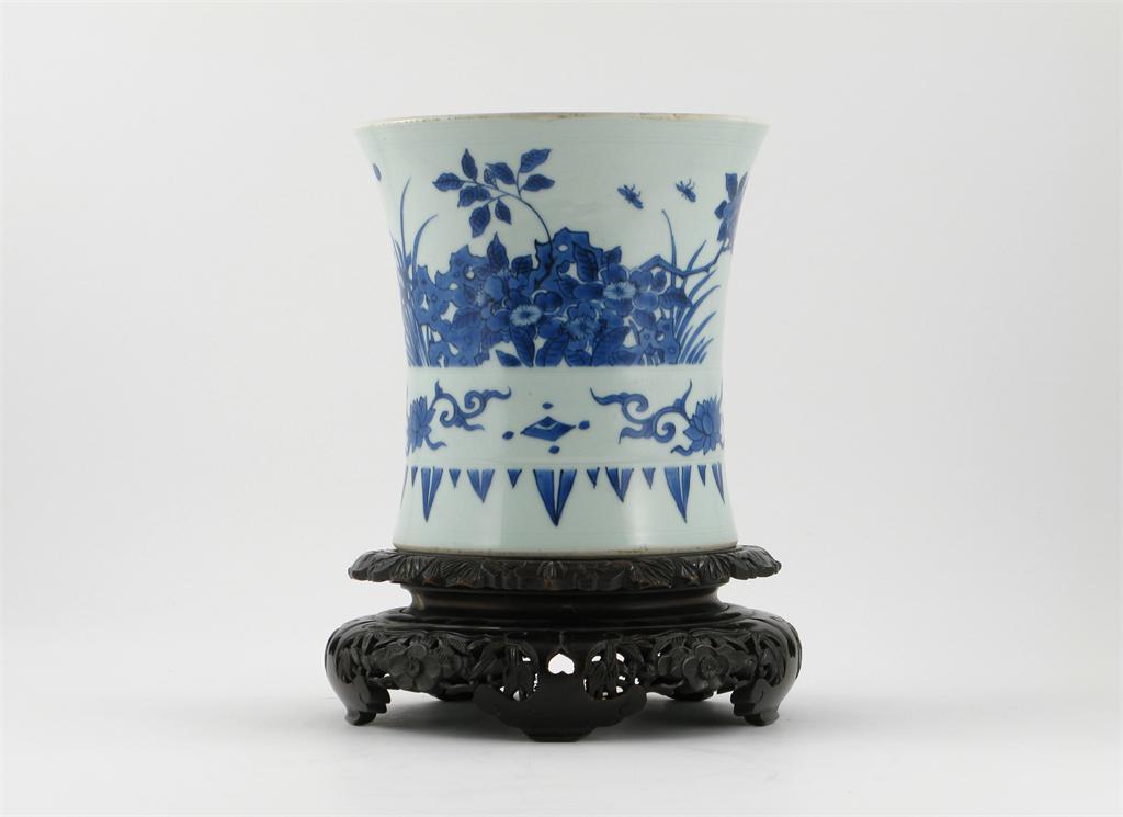A large Chinese blue and white flared cylindrical brushpot, well painted with three birds in flight and insects amidst flowering branches, rockwork and iris, above a band of lotus and another of stiff leaves, the body incised with lines, Transitional c.1640, the rim with a few polished chips, 20.5cm. Together with a carved hardwood stand. (2)
