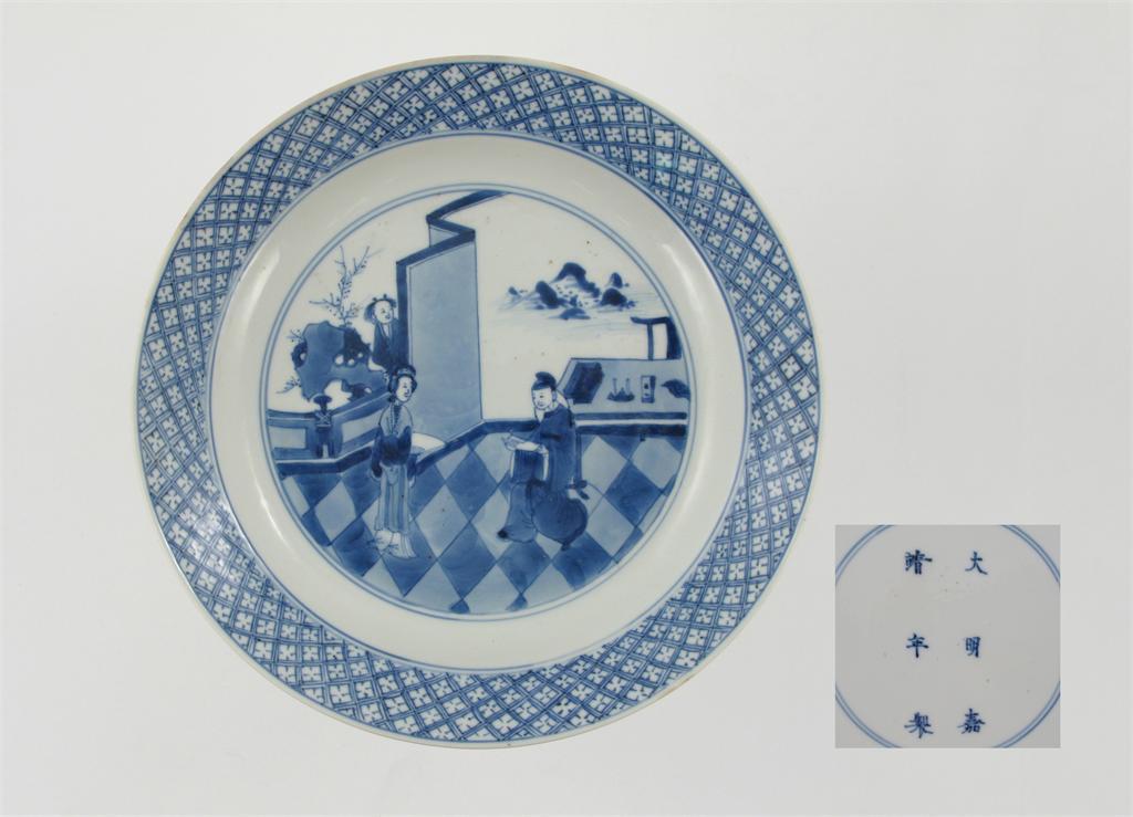 A good Chinese blue and white plate, painted with three figures in an interior, the reverse with a six character Jiajing mark but Kangxi 1662-1722, 20.8cm.