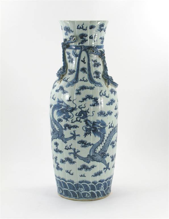 A large Chinese blue and white vase, moulded with pleats, applied and painted with ferocious scaly dragons, c.1900, 61cm.