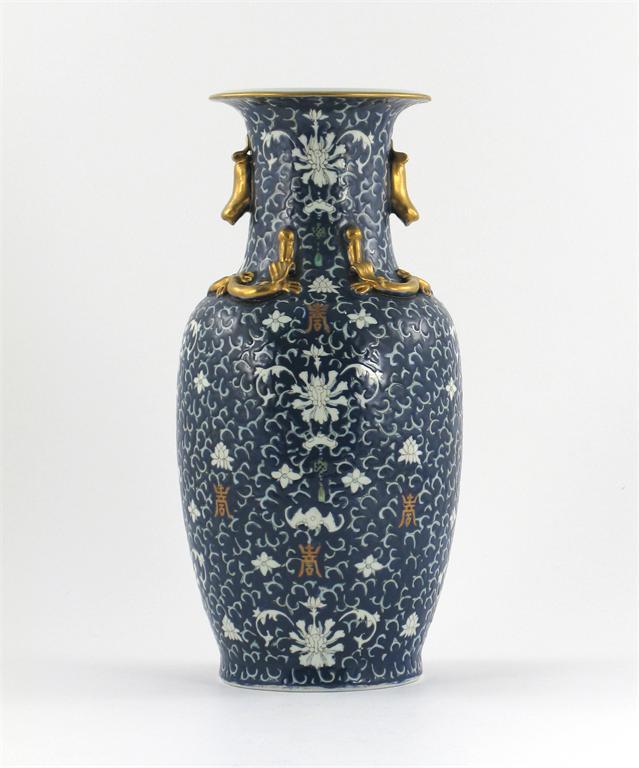 A Chinese baluster vase, decorated with lotus, shou characters and bats on a blue enamel ground, the base with a six character Kangxi mark but later, 35.5cm.