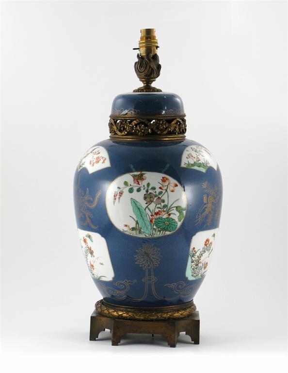 A Samson famille verte powder blue ground ovoid vase, with gilt metal fittings as a table lamp, fungus and Samson factory marks, late 19th century, the cover extensively damaged, 42cm.