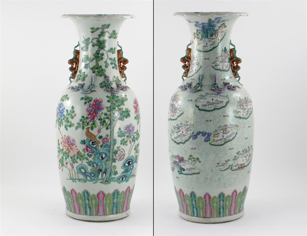 A good Chinese famille rose vase, painted with an unusual design of ten islands, each with small pagodas and buildings, the reverse brightly enamelled with a leafy tree, flowers and a pheasant on holey rockwork, 19th century, 62.5cm.
