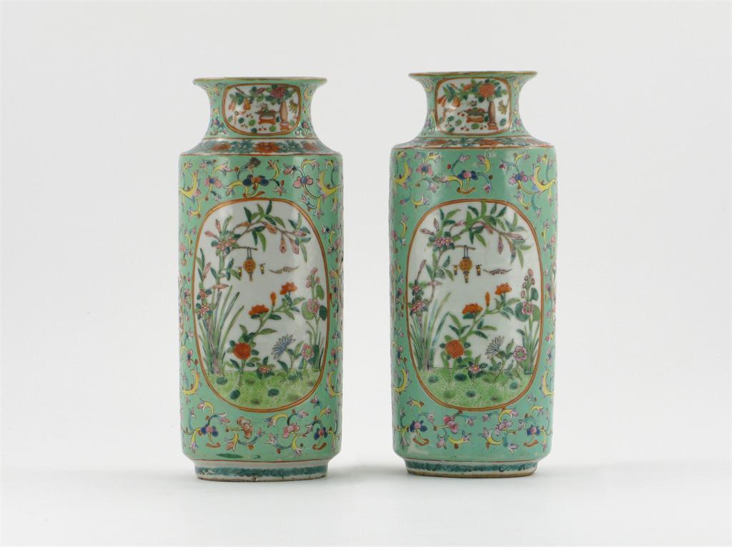 A pair of Chinese cylindrical vases, each painted with panels containing flowers, flags and bats, on a green ground decorated with formal flowers and foliage, each with a six character Jiaqing seal mark and probably of the period, 24.6cm. (2)