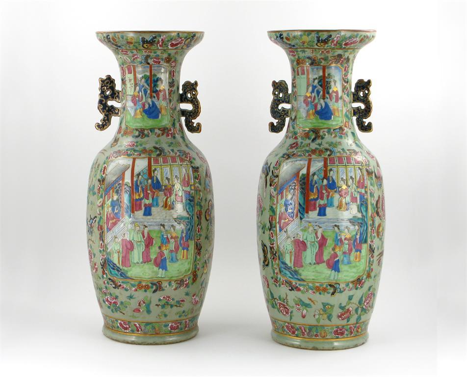 A large pair of Chinese Canton celadon ground vases