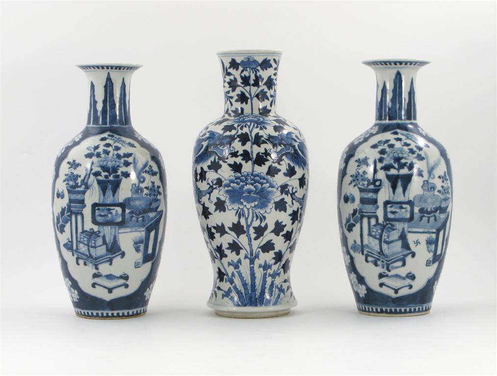 A pair of Chinese blue and white ovoid vases, painted with panels of vases on a ground of prunus sprays, and a Chinese baluster vase painted with dragons, all late 19th century, 36.5cm max. (3)