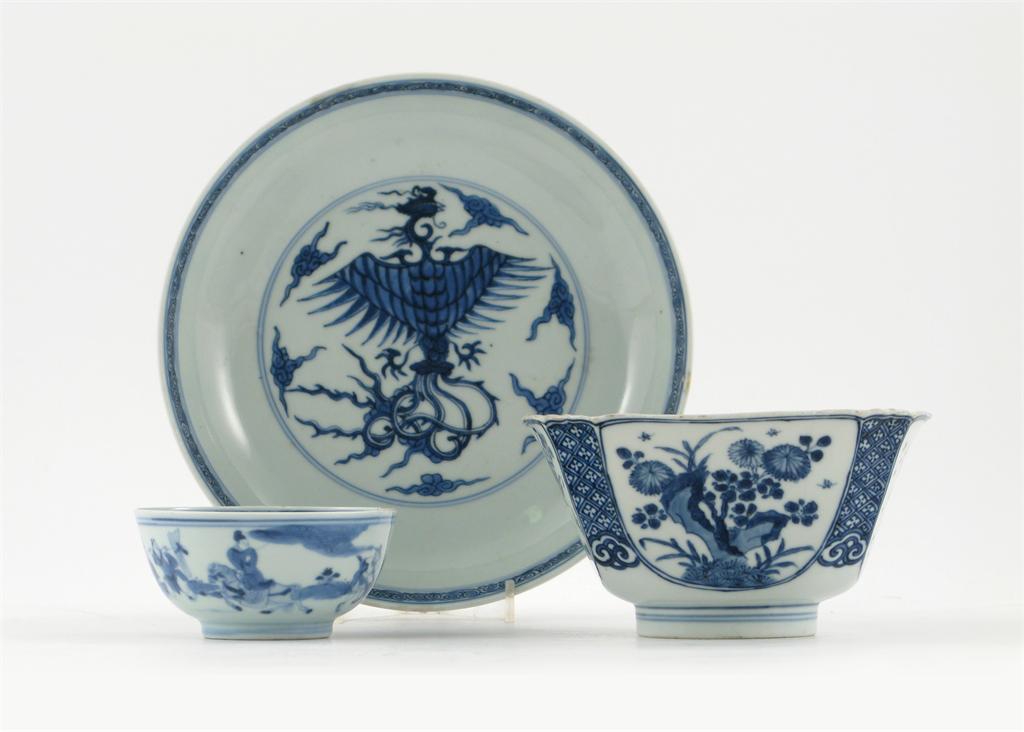 A Chinese blue and white phoenix dish, a blue and white bowl painted with panels of flowers, ducks and other birds, and a small bowl painted with six figures, all marked, all 18th century, 20.7cm max. (3)