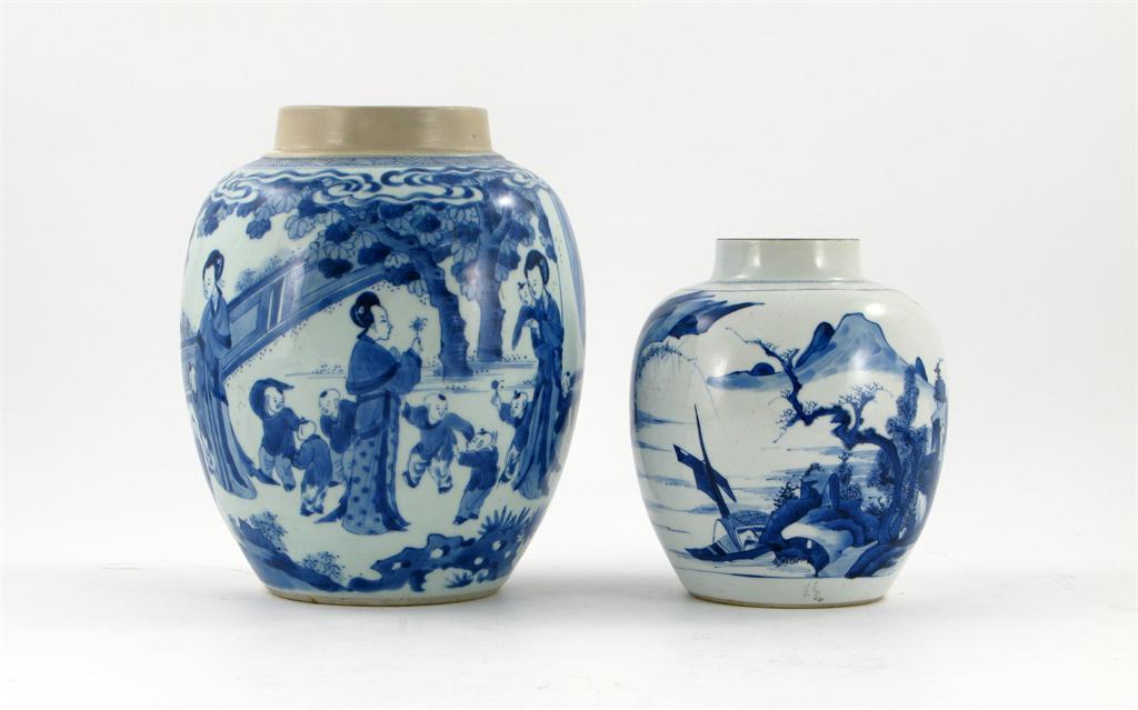 Two Chinese blue and white ovoid vases, the smaller decorated with boys, lotus and a landscape, the other with figures with children in a garden, 17th / 18th century, both with damages, 23cm max. (2)