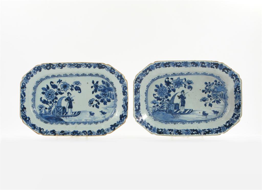 A pair of Chinese blue and white chamfered rectangular dishes, each decorated with a figure in a boat, 18th century, 27cm. (2)