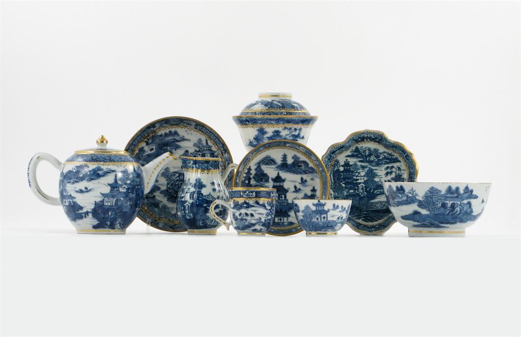 A Chinese blue and white part tea and coffee service, each piece decorated with a pagoda landscape and with additional European gilding, 18th century, damages. Comprising: a teapot, nine saucers, five coffee cans, six tea bowls, a sparrow beak jug, two saucer dishes, a bowl, a covered bowl and an English teapot stand and spoon stand. (30)