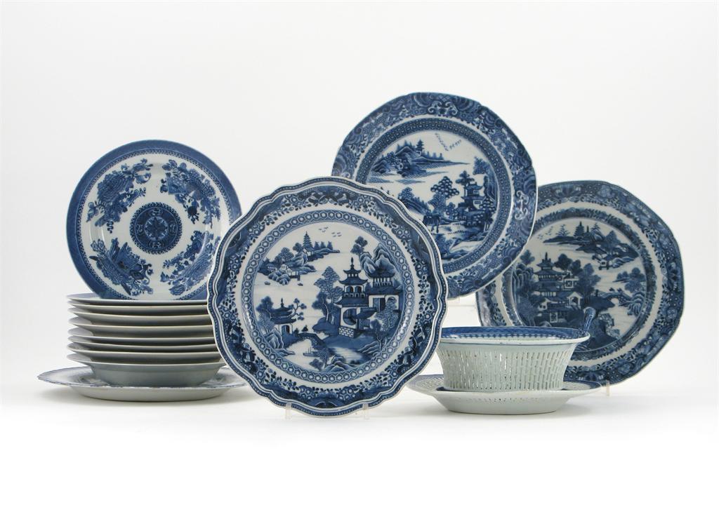 Chinese blue and white porcelain, most decorated with the Aster and Fitzhugh patterns, 18th and 19th centuries, minor damages. Comprising: a reticulated basket and stand, nine soup plates, and nine other pieces. (15)