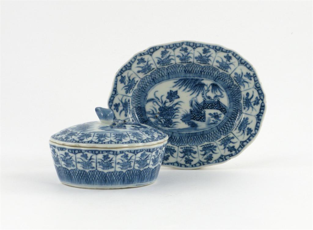 A Chinese blue and white oval butter dish, cover and stand, decorated with flowers and foliage, 18th century, 15.5cm. (3)