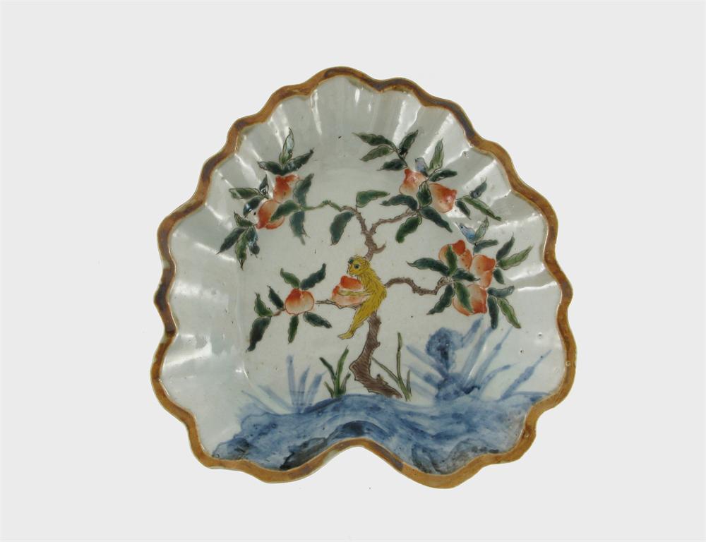A Chinese dish, decorated with a small hairy yellow monkey, sitting in a tree and clasping a large peach, the base with a four character Tianqi mark, 19.7cm.