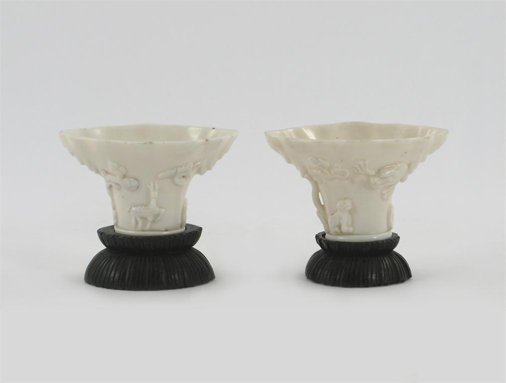 Two Chinese blanc de Chine libation cups, moulded and applied with deer, dragons, other animals and trees, one with an incised mark to the base, 18th century, 10.5cm. Each with a carved hardwood stand. (4)