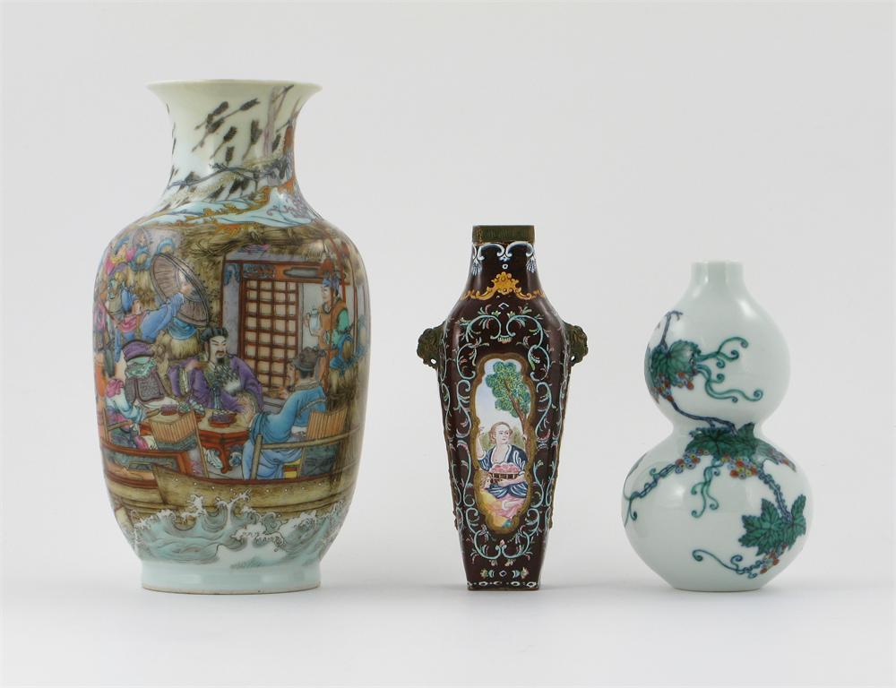 Three Chinese vases, one painted with figures under siege from fire and arrows, and with calligraphy to the reverse, another doucai decorated with squirrels and fruiting vines, the third Canton enamel decorated with panels of European ladies, all with reign marks but later, damages, 18.8cm max. (3)
