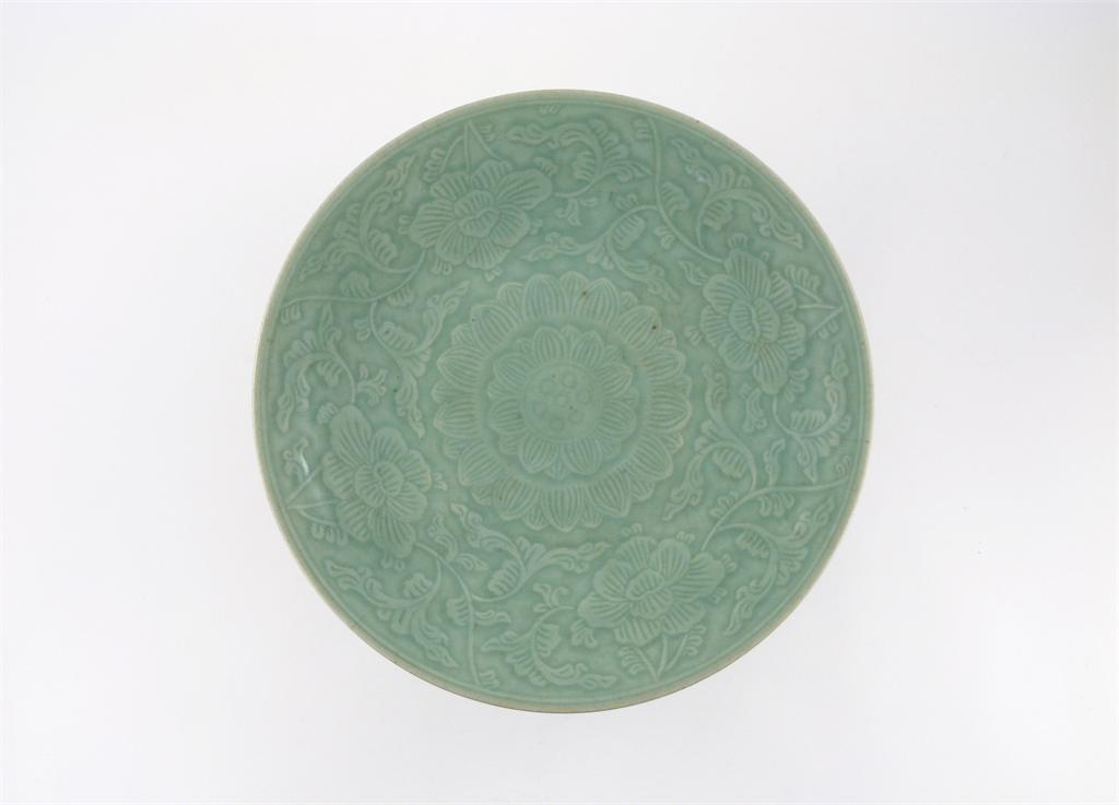 A Chinese celadon dish, moulded with an all over floral design, 19th century, a faint rim crack, 37.5cm. Together with a hardwood stand. (2)