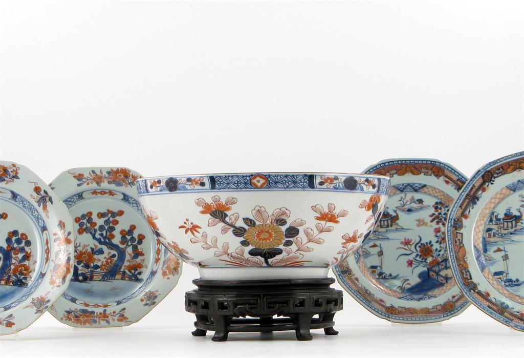 An Imari bowl, typically decorated with flowers and foliage, two Chinese Imari soup plates and two further plates, 18th century and later, minor faults, 31.5cm max. Together with a wood stand. (6)