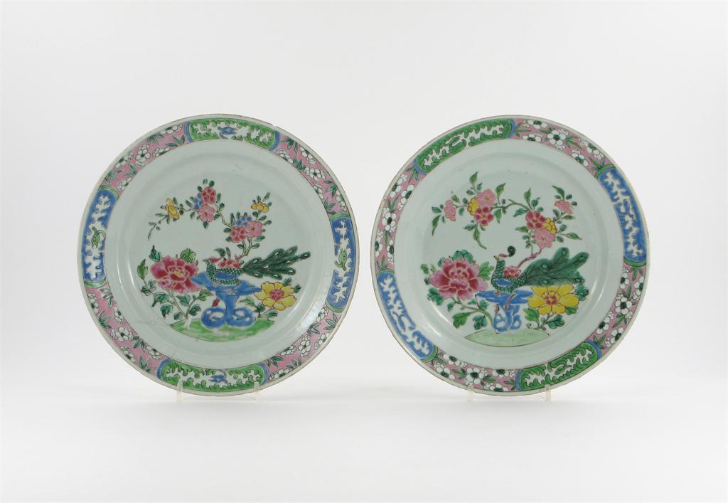 A pair of Chinese famille rose dishes, each decorated with a peacock on rockwork, amidst peony and prunus, 18th century, one broken, 27.5cm. (2)