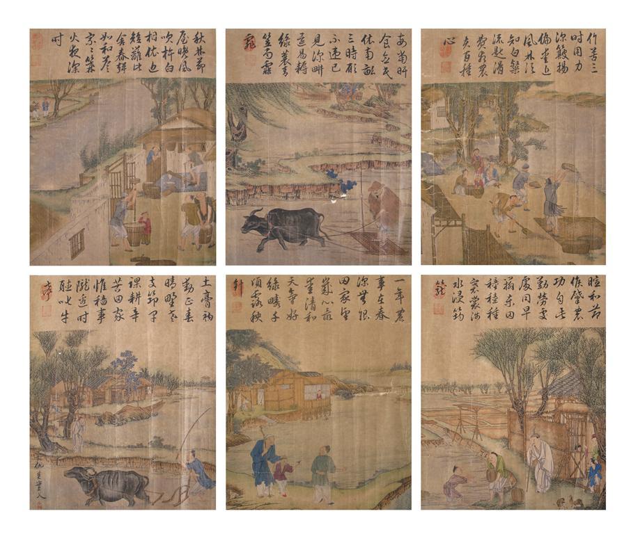 A set of twelve Chinese paintings mounted on a continuous scroll, depicting all aspects rice production, 19th century, 61cm x 47cm each.