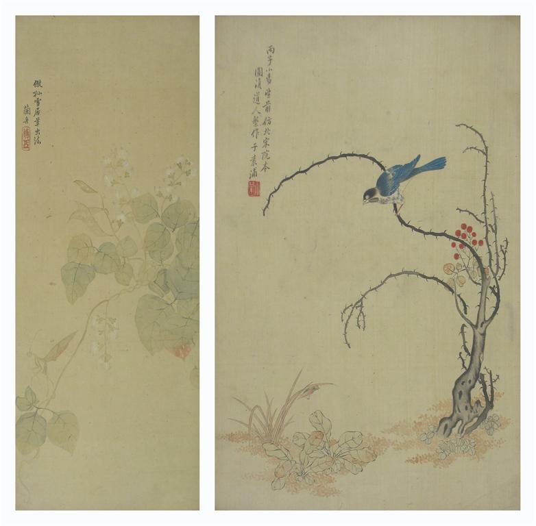 Two Chinese paintings on silk, one of a praying mantis on flowering tendrils, the other of a blue bird perched on a thorny bush, both with columns of calligraphy, 53cm. Framed and glazed. (2)