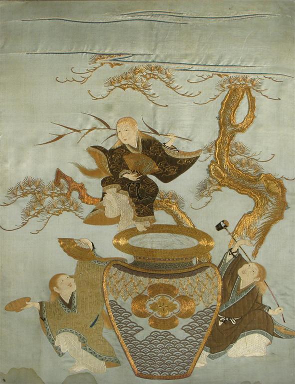 An embroidered silk panel, decorated with three figure dancing around a giant vase beneath a pine tree, 19th century, some staining, 82.5cm.