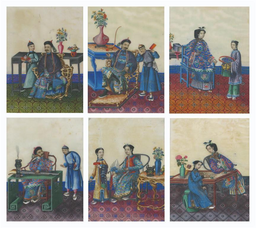 A set of eight Chinese pith paper paintings, depicting figures at various pursuits in interiors, 19th century, some damages, 25.5cm. Framed and glazed. (8)