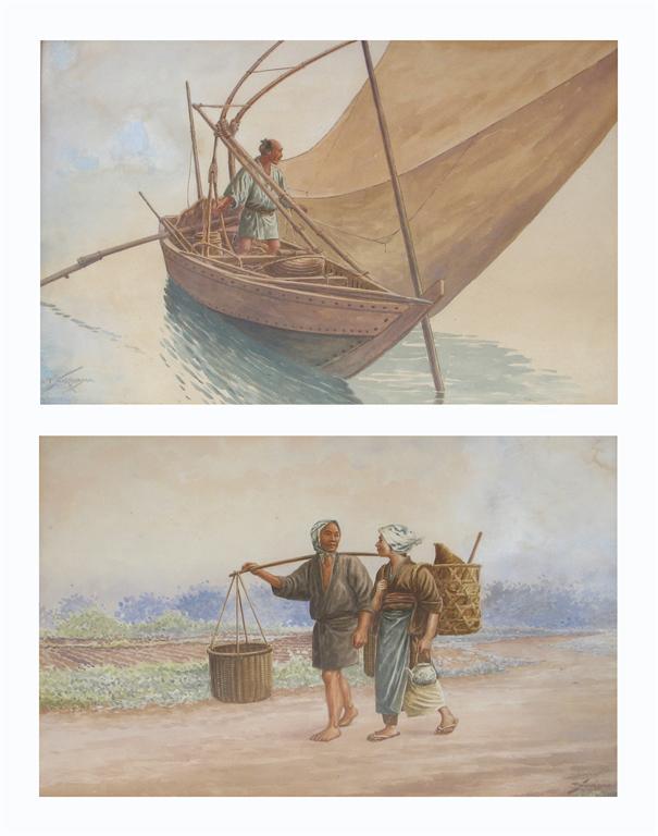 Two Japanese watercolours, one of peasants walking amidst fields the other a figure in a small sailing vessel, both inscribed Nakayama, 48cm. (2)