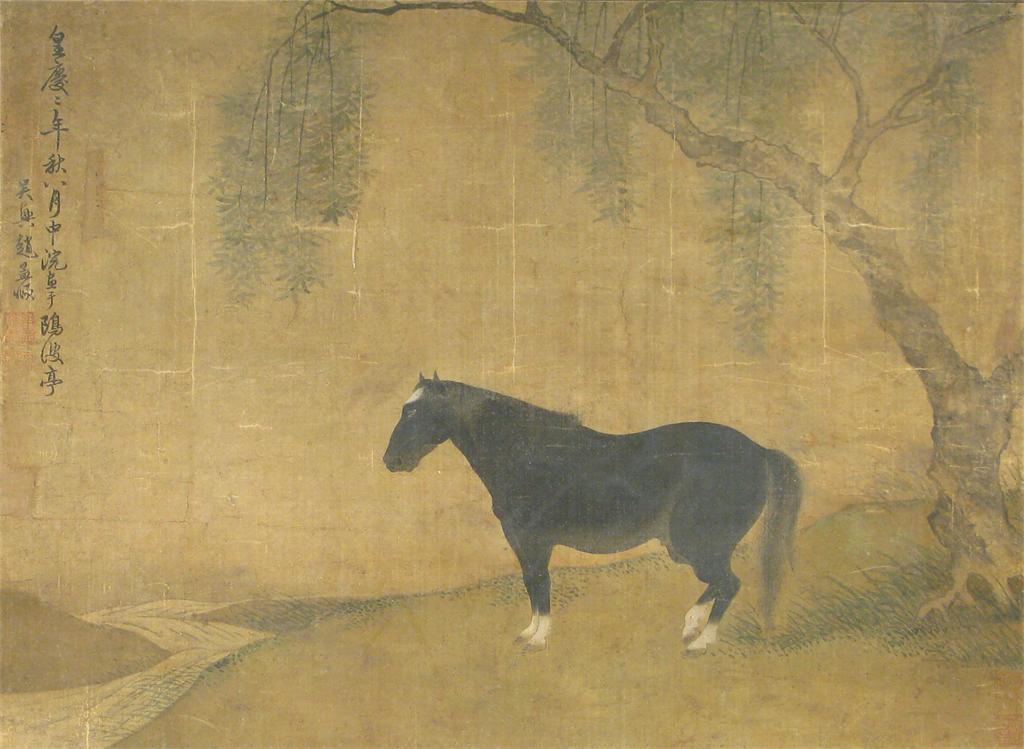 A Chinese painting of a black horse, standing beneath a willow tree, with two lines of calligraphy and four seals, inscribed Zhao Mengfu and with a date corresponding to 1313 but later, old restoration, 66cm.