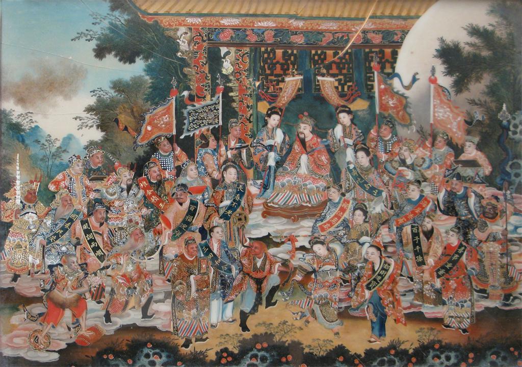 A Chinese reverse glass painting, depicting a throned official surrounded by a multitude of attendants, 19th century, the plate shattered, 80cm.