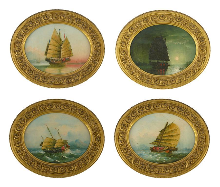 Four oval oil paintings on canvas, of Chinese junks, 18.5cm. (4)