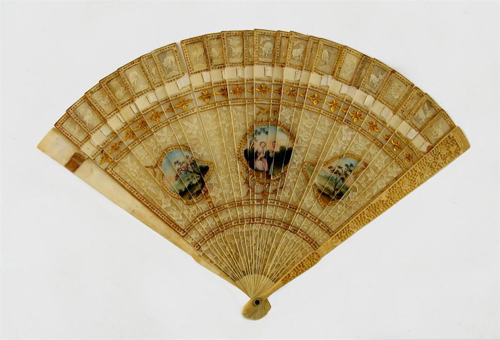 A Chinese ivory brisé fan, painted with three panels, one containing figures, the others landscapes, and finely carved with flowers and various animals, heightened with gilt, 19th century, damages.