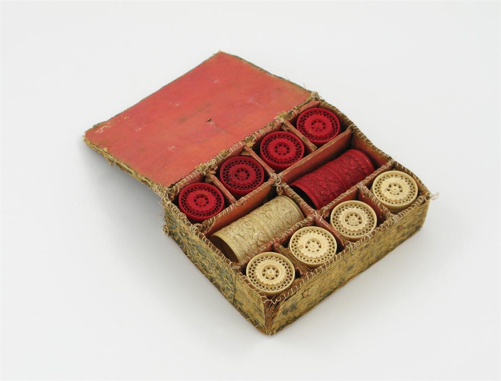 A Chinese Canton set of ivory draughts and dice pots, contained in a fitted box, 19th century, the box worn and damaged.