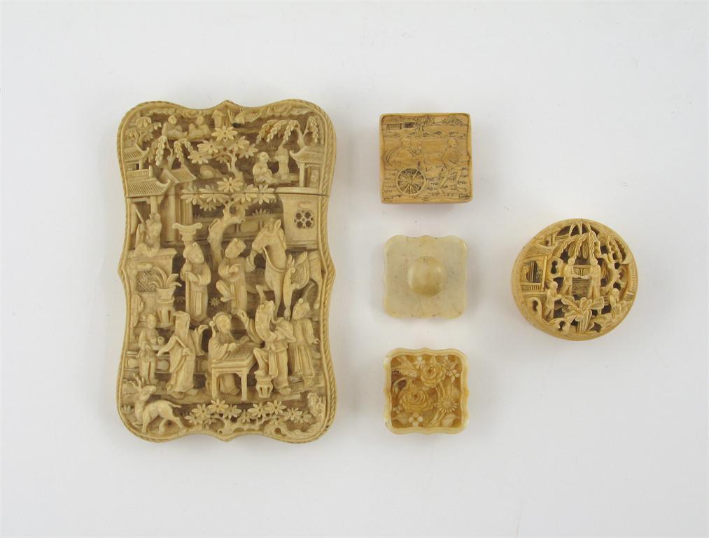 A Chinese Canton ivory cardcase, carved with figures and animals, a small circular box containing nine mother of pearl counters, and three carved ivory studs, 11.5cm max. (7)