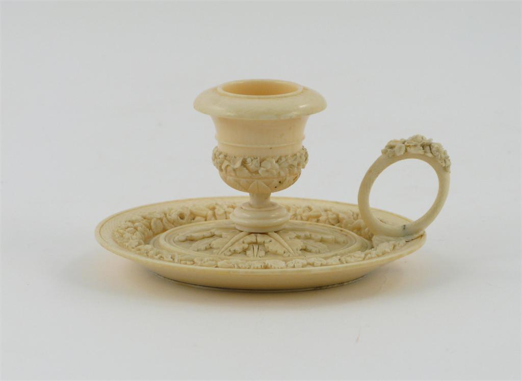 An ivory oval chamber stick, finely carved with foliage and flowers, 19th century, a rim section glued, 12cm.