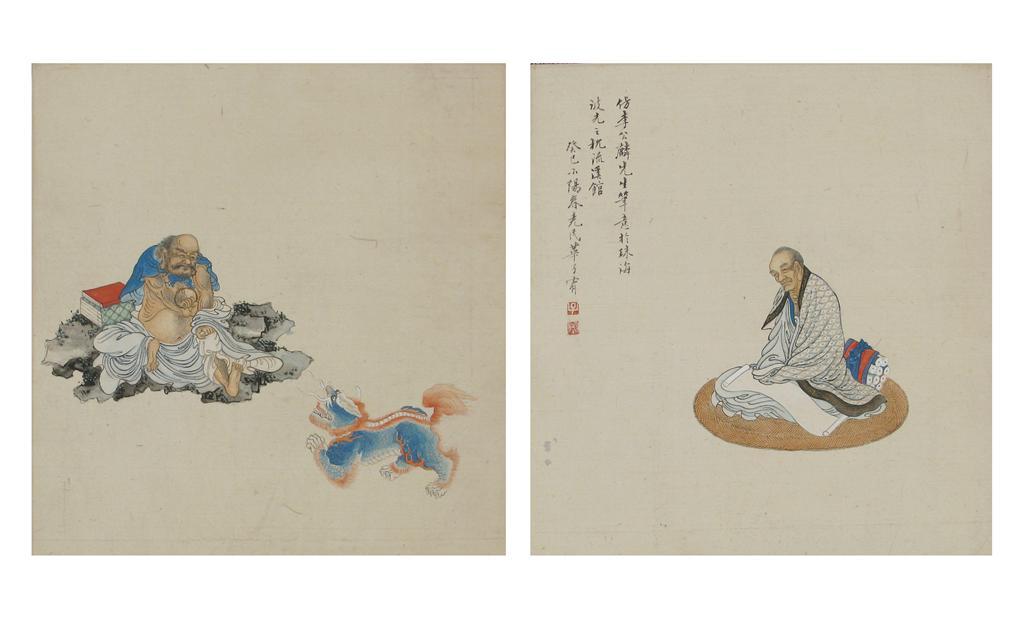Two Chinese watercolours, depicting an immortal with a lion dog, the other with a seated scholar, the latter with three lines of calligraphy, 19th century, 26cm. (2)