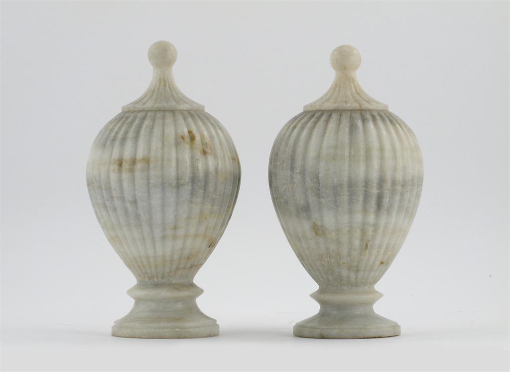 A pair of Middle Eastern white marble urns and covers, with ribbed ovoid bodies and circular pedestals, some damages and repairs, 24cm. (4)