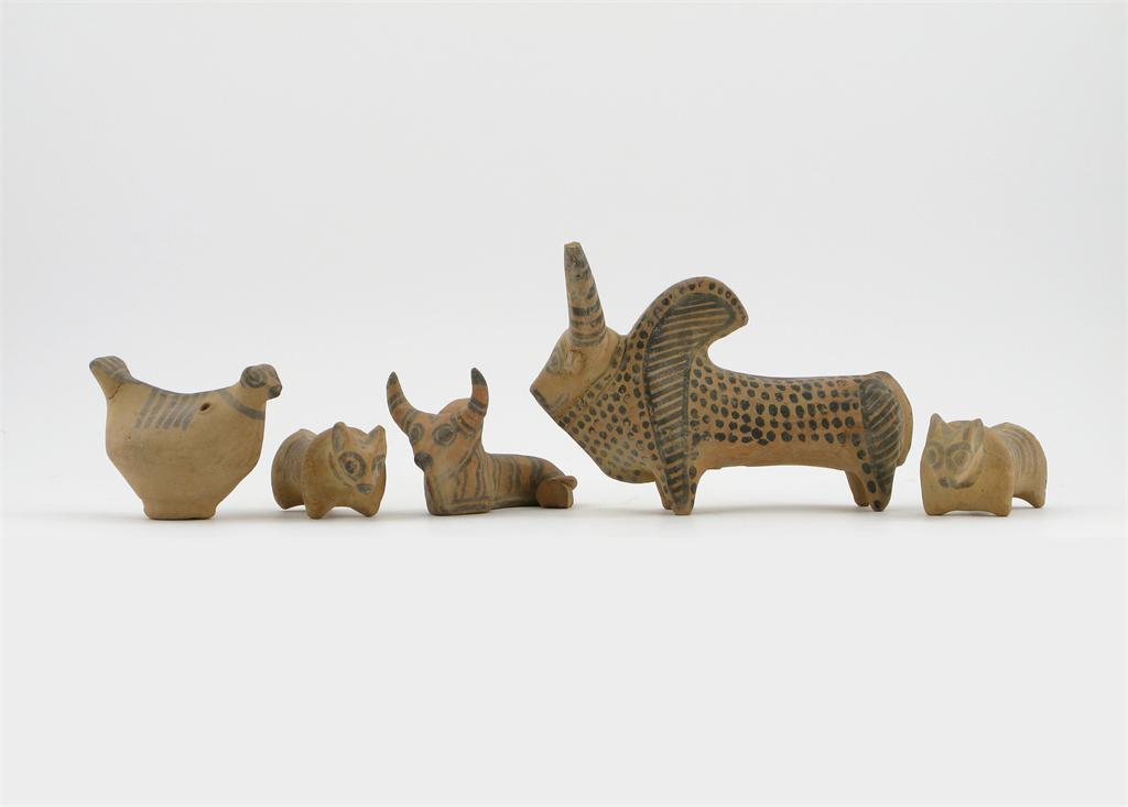 Five Middle Eastern pottery models of animals, painted with geometric patterns, damages, 20cm max. (5)