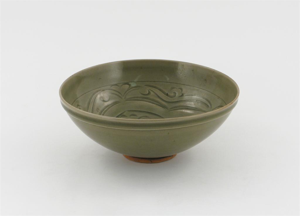 A Chinese celadon bowl, finely carved with a central roundel and scrolling stylized foliage, 20.4cm.