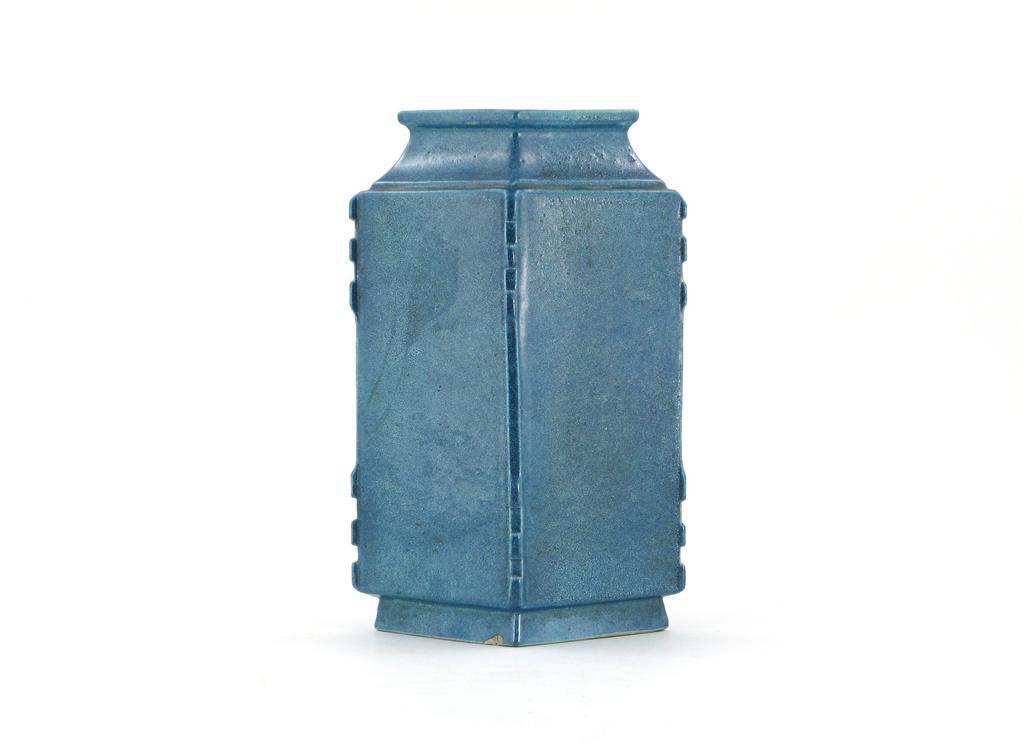 A Chinese lozenge-shaped vase, decorated with an all over robin's egg glaze, unmarked, probably 19th century, small chips around the footrim, 26.5cm.