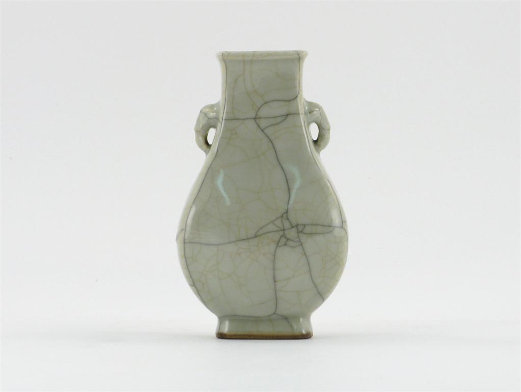 A small Chinese crackle-glazed hu-shaped vase, with elephant handles on a rectangular foot, unmarked, 18th / 19th century, 16cm. Provenance: From the collection of C. Mackechnie-Jarvis, OCS member.