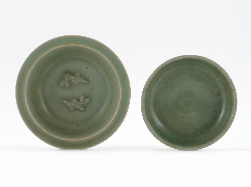 Two Chinese celadon dishes, one moulded with twin fish in the interior, the other with a curved profile, Song / Ming, damages, 12.5cm max. (2)