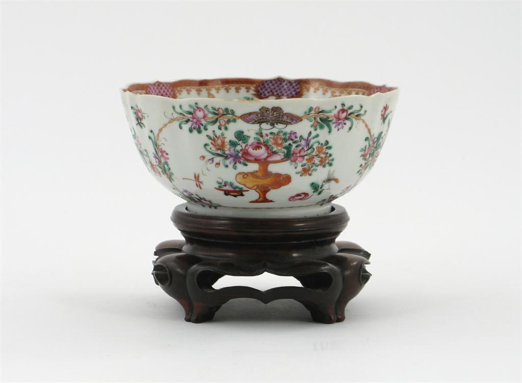 A Chinese famille rose bowl, delicately painted with butterflies and small insects, vases of flowers and scattered sprays, 18th century, 14cm. Together with a hardwood stand. (2)