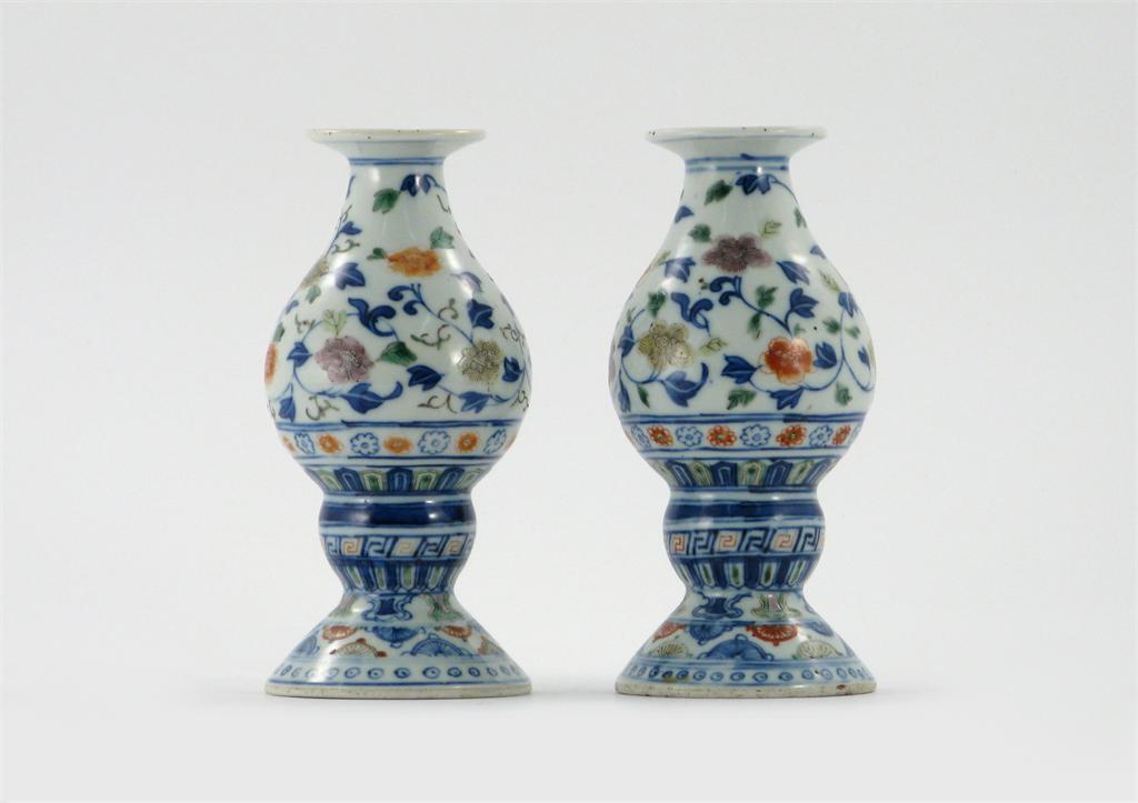 A pair of Chinese pear-shaped vases or candlesticks, of Islamic form, painted in underglaze blue and coloured enamels with scrolling flowers and foliage, each with a six character Qianlong seal mark but 19th century, a chip and associated crack to one rim, 16cm. (2)