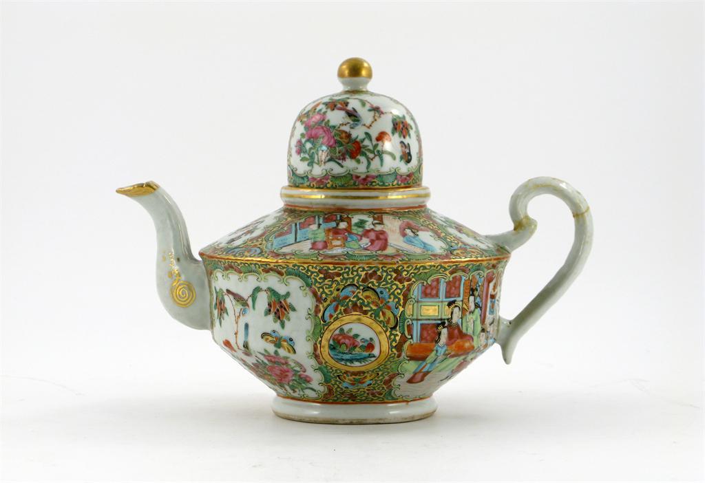 A Chinese Canton famille rose teapot and cover, typically decorated with colourful panels of figures, flowers, birds and fruit, 19th century, damages, 29.5cm. (2)