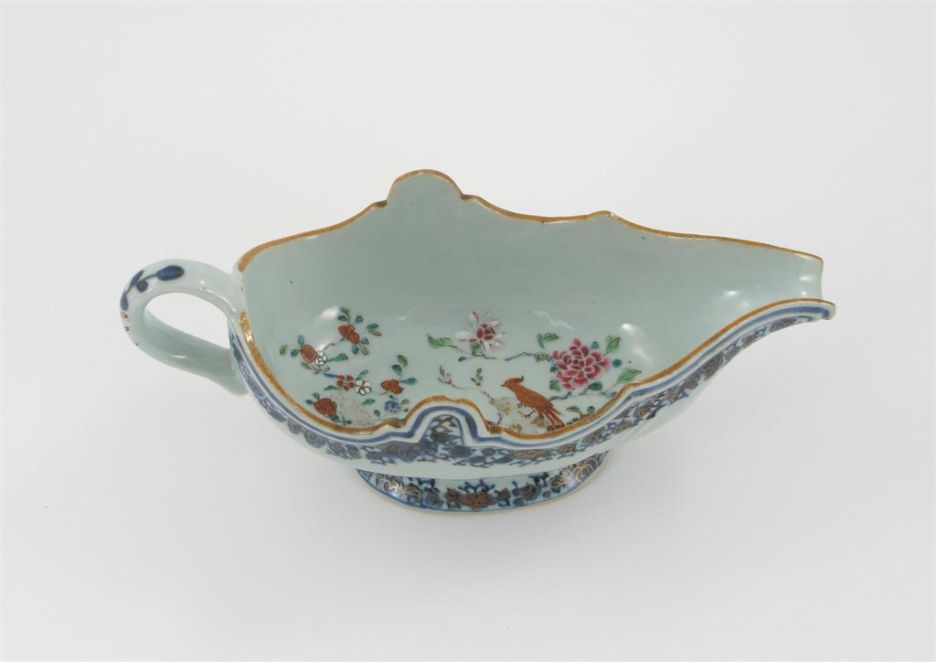 A Chinese famille rose silver-shaped sauce boat, painted with two birds on rocks amidst flowers, 18th century, one tiny rim chip, 24cm.